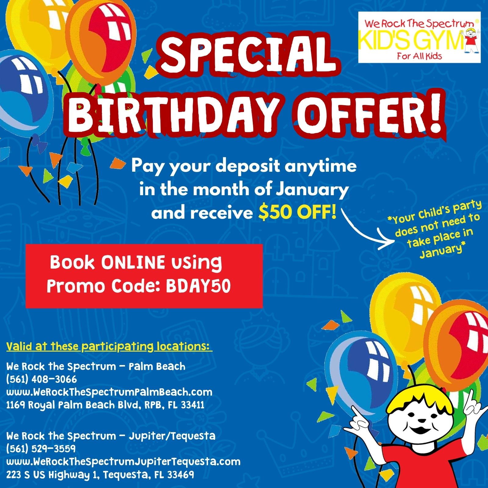 For the entire month of January, families can enjoy $50 OFF any birthday party package at both of our locationswhen booked during January.