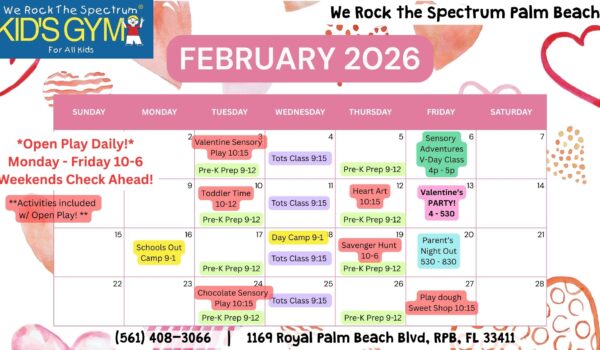 February Open Play Events at We Rock the Spectrum Indoor Kids Activities in Palm Beach County Looking for fun indoor activities for kids in February? We Rock the Spectrum Kid’s Gym is hosting themed February Open Play events all month long — all included with regular open play admission. Our February activities feature Valentine and friendship themes, sensory play, creative art, movement, and toddler-friendly experiences for children of all abilities.…